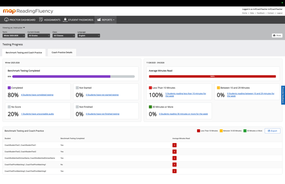 More detailed student Coach usage and results data is available from the Coach tile on the MAP Start Page under MAP Reading Fluency.
