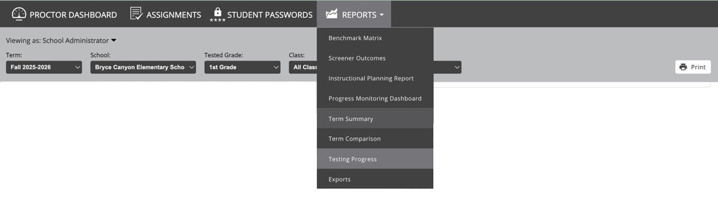 Access the Testing Progress report from the Reports tab within MAP Reading Fluency. From any view, select Reports and then choose Testing Progress.